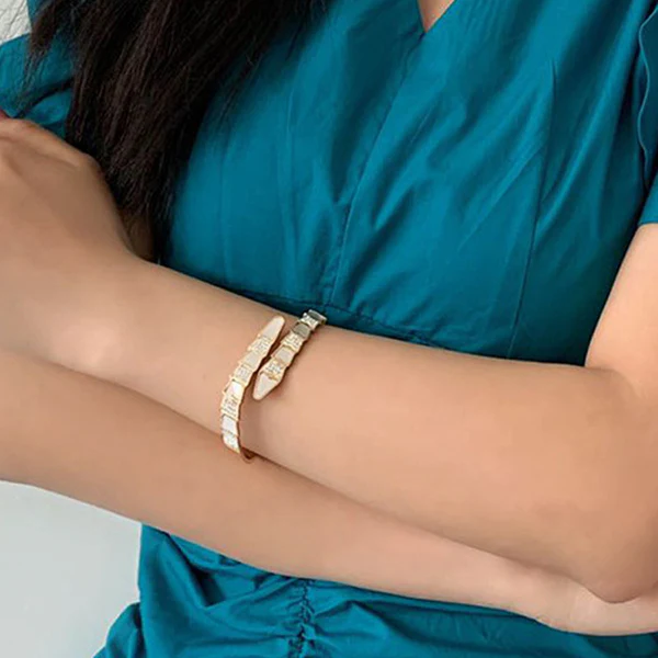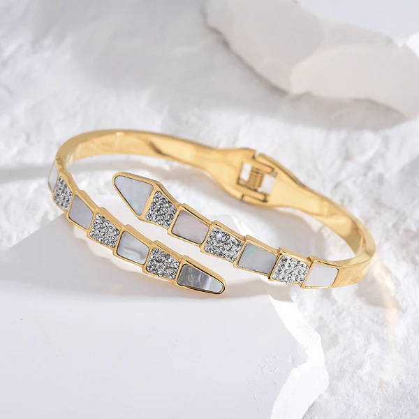 Stainless Steel Gold Plated Mother of Pearl Snake Styled AD Studded Anti-Tarnish Bracelet For Women