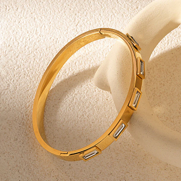 This Stainless Steel Gold-Plated White Rectangular American Diamond studded Bangle-Style Anti-Tarnish Bracelet For Women balances design, versatility, and craftsmanship, making it an ideal addition to any collection. Whether you’re a business owner selling offline or an e-commerce seller on platforms like Meesho, Amazon, Ajio, or Flipkart, this product is designed to meet the diverse needs of your customers.